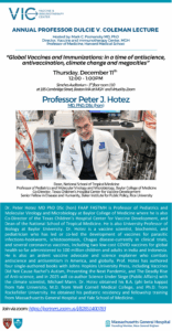 Join the Vaccine and Immunotherapy Center for the Annual Professor Dulcie V. Coleman Lecture with Dr. Peter Hotez – expert in global health and vaccine advocate, as he discusses “Global Vaccines and Immunizations: in a time of antiscience, antivaccination, climate change and megacities.” More details can be found below.